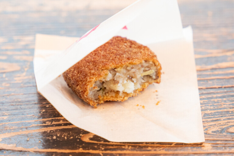 定番の人気メニューは「コロッケ」と「メンチカツ」。コロッケは村上牛のひき肉とポテトの素朴な旨みが魅力で、メンチカツは“合いびき”ではなく、村上牛100%!お肉の味がダイレクトに伝わり、ジューシーで食べ応えのある逸品です。最近は若い世代向けにチーズ入りも登場し、幅広い層に愛されています。お近くにお越しの際はぜひ立ち寄ってみてください。