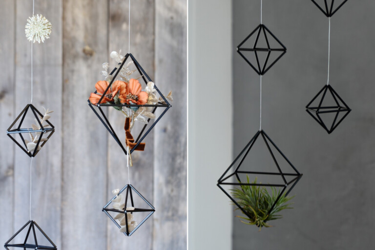 エアプランツやスワッグを中に入れたり、タッセルやビーズを加えたりと、アレンジも自由自在。黒アルマイトのシンプルな造形は、どんなインテリアにもなじみやすく、ナチュラルにもモダンにも合わせやすいデザインです。
