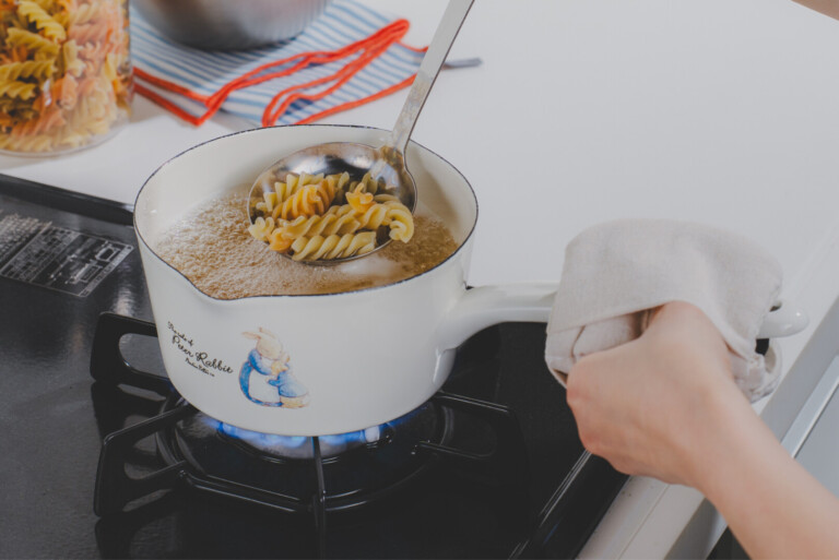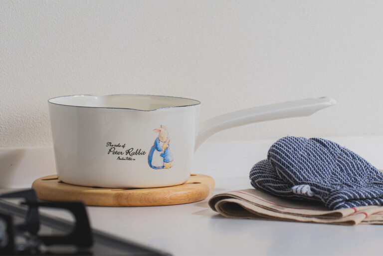 「ピーターラビット」のおはなしの世界観を、清潔感のある白いホーローにデザインしたキッチンシリーズ。こちらのホーローミルクパンは、牛乳やスープの温めにちょうどいい15サイズの片手鍋。3~4人分のスープや味噌汁づくりにも使いやすく、毎日の台所で自然と出番が増える大きさ。愛らしいデザインでありながら、しっかりとした作りと扱いやすさを兼ね備えた一品です。母の日の贈り物や、ギフトにもおすすめです。
