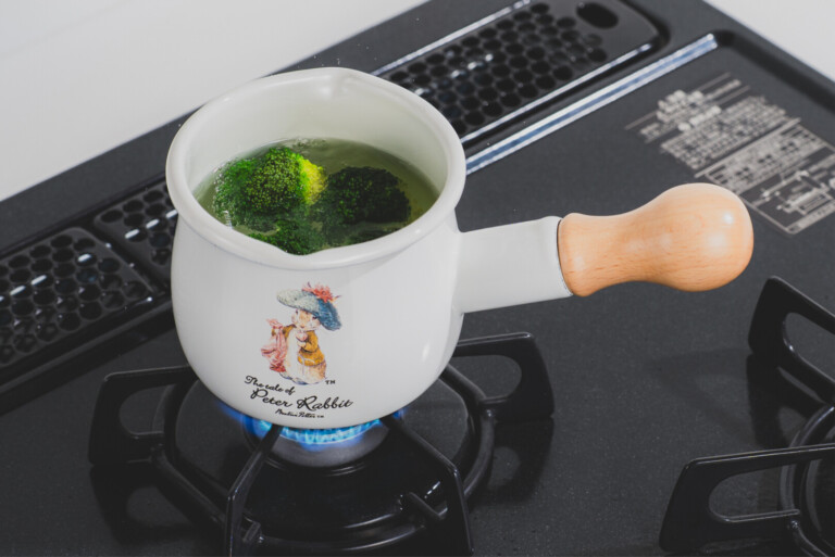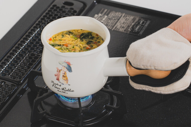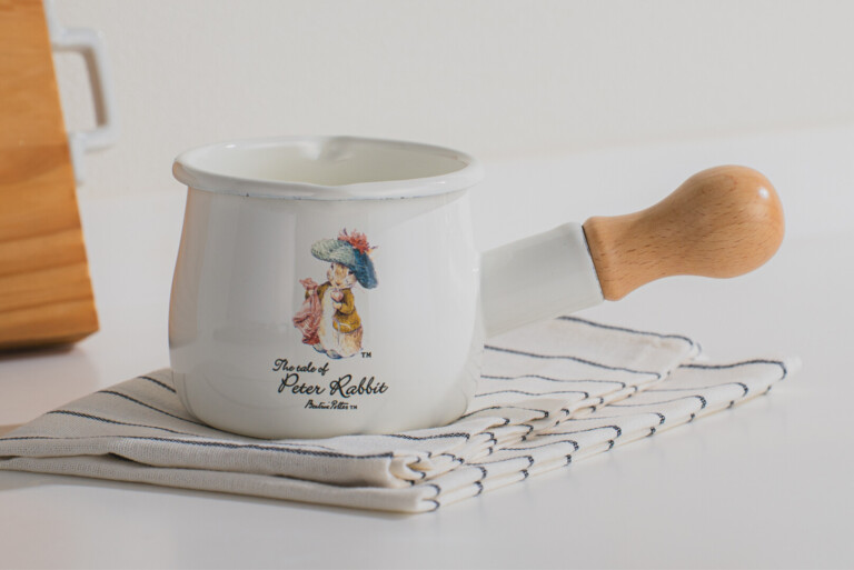 「ピーターラビット」のおはなしの世界観を、清潔感のある白いホーローにデザインしたキッチンシリーズ。こちらのプチミルクパン(550mL)は、ちょっとだけ温めたいときに便利な小さめサイズのホーロー片手鍋。牛乳一杯分を温めたり、少量のスープを作ったり。可愛らしい佇まいながら、しっかりとした作りで、毎日の台所に自然と寄り添います。母の日の贈り物や、ギフトにもおすすめです。