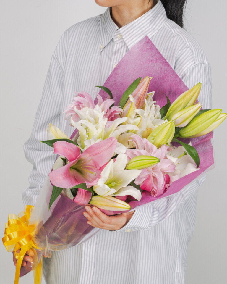 一重咲きのオリエンタルユリと、八重咲きユリを組み合わせた特別なブーケ。王道の華やかさと、重なり合う花びらのやわらかな表情。それぞれの魅力が合わさることで、奥行きのある印象的な花束に仕上がっています。ユリがお好きな方にはもちろん、普段あまりなじみのない方にも喜んでいただける一束です。箱を開けた瞬間に広がる、華やかさと上品な香り。さまざまなユリをあわせて仕立てたブーケだからこそ味わえる、特別なひとときをお楽しみください。