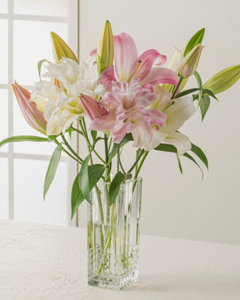 白いユリの花言葉は「純潔」「無垢」。ピンクのユリには「上品」「優雅」「愛と幸福」「富と繁栄」など。八重咲きユリには「豊かさ」「祝福」「壮大な美」といった花言葉が込められています。それぞれの魅力をあわせ持つミックスは、華やかさとやさしさを兼ね備えた印象で、さまざまなお祝いのシーンにおすすめです。誕生日や結婚記念日、母の日、開店・開業祝いなどの贈り物にはもちろん、ご自宅用としても空間を明るく彩ってくれます。